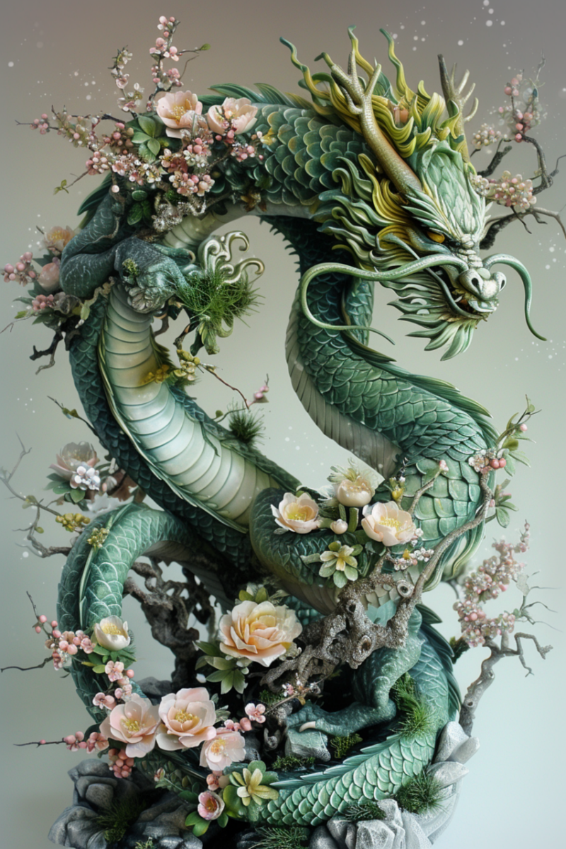 - Le bois: Dans le système des cinq éléments chinois, le bois est associé à l'Est et au printemps. Le dragon vert est donc souvent considéré comme un symbole de l'élément bois, qui représente la croissance, la créativité et la vitalité.